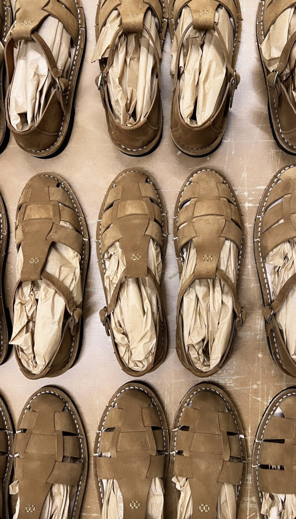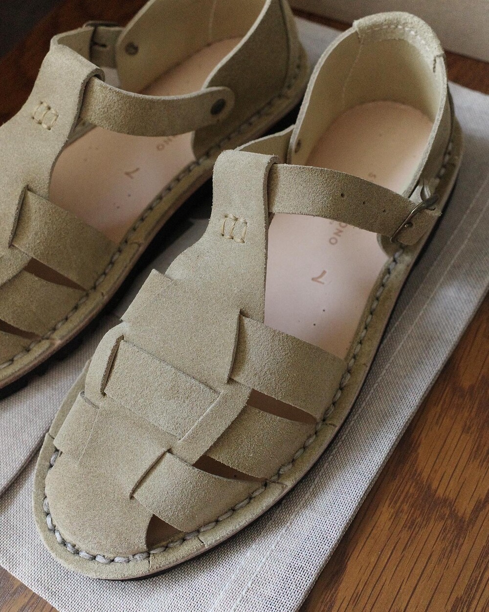 안쪽 밑창의 작은 핀 표시는 전통적인 핸드메이드 작업의 특징입니다.
